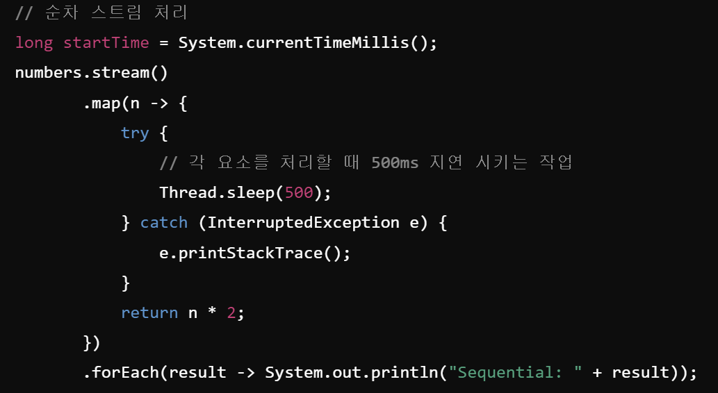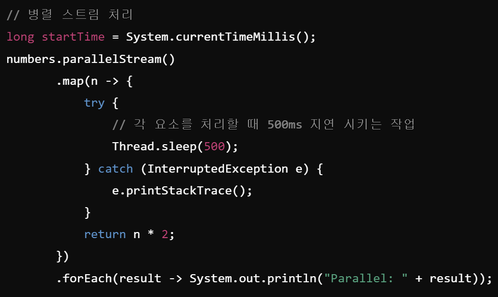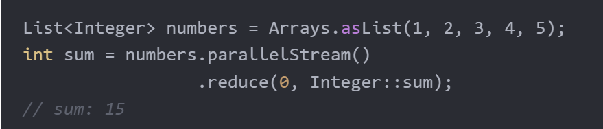 - 병렬처리. 대용량데이터 처리에서 유용. 각 요소들이 동시에 여러스레드에서 병렬 처리됨