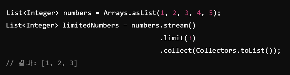 - 스트림 요소 중 n개 까지만 선택하는 중간연산