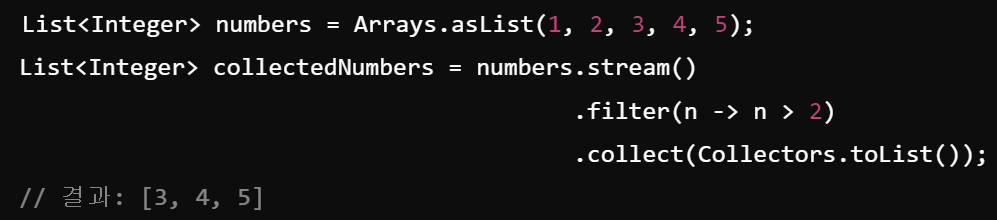 - 스트림의 결과를 리스트, 셋 등의 컬렉션으로 변환하는 최종 연산